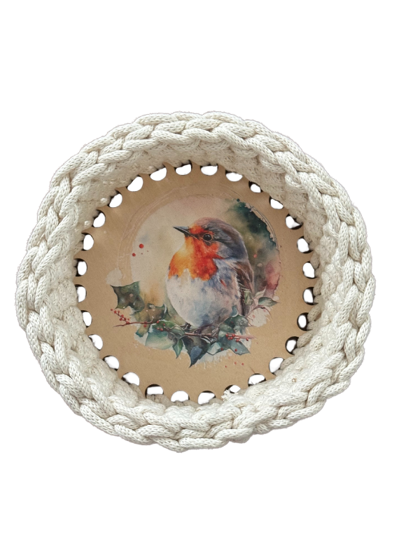 Ručně háčkovaný kulatý košík může sloužit dle vaší fantazie téměř v celém vašem domově. Vnitřní průměr: cca 12 cm Výška: cca 8 cm Překližkové dno má 3 mm – je dekorované obrázkem. Barevné provedení výrobku může být nepatrně odlišné Tento výrobek je dekorativní předmět, nejedná se o hračku. Není určen pro děti, zejména pro malé děti do 3…