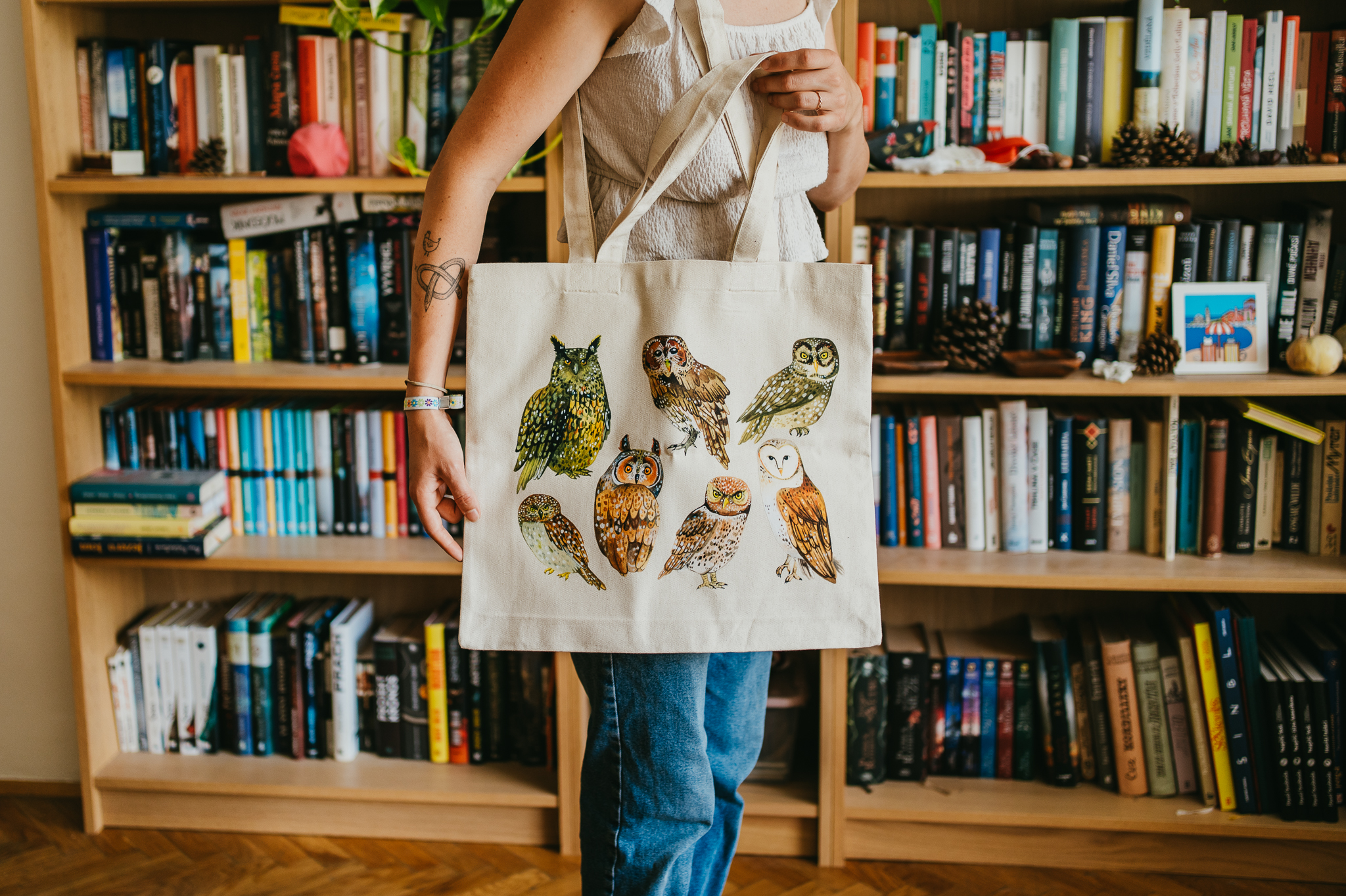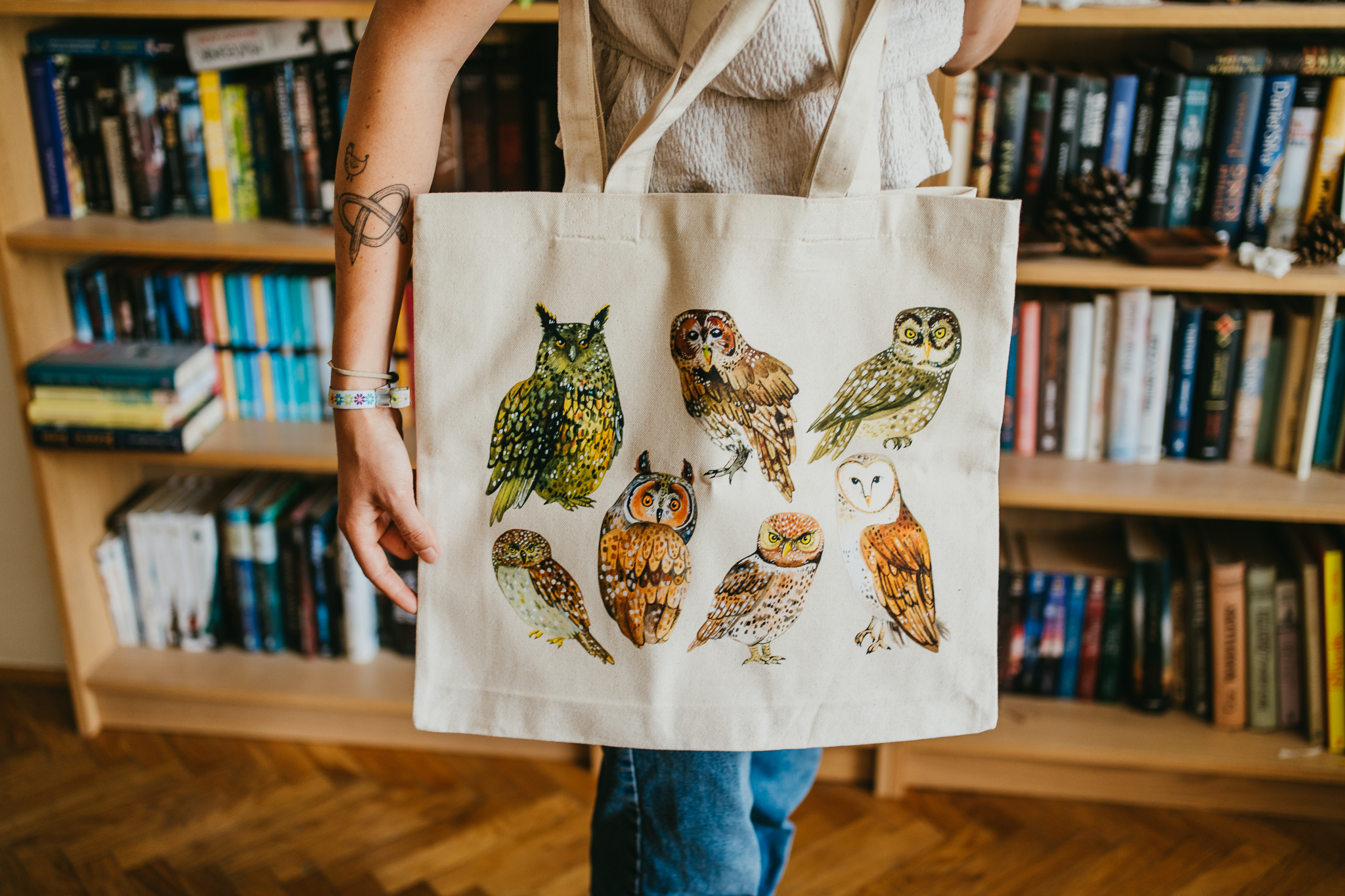 Plátěná taška s našim autorským potiskem v oblíbeném motivu českých sov.