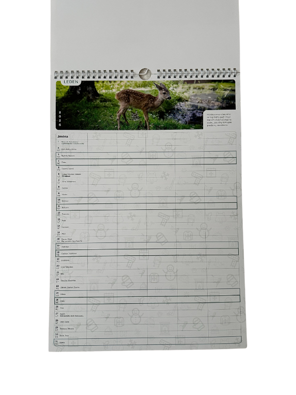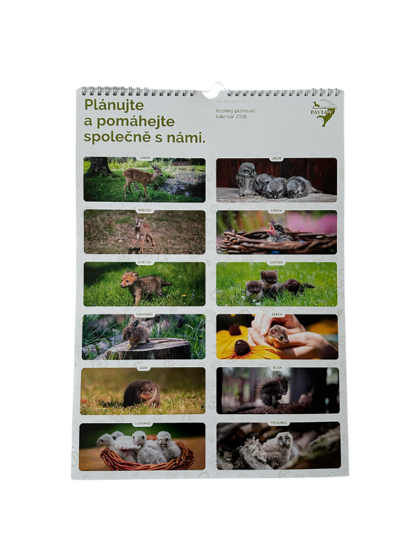 Rodinný plánovací kalendář pro 5 osob. Kalendář z dílny naší stanice, vyrobený ve Světlé nad Sázavou by Popy reklama. Buďte celý rok v obraze, kolikátého vlastně je, co každého z vás který den čeká, a těšte se z momentek zvířat zachycených naším fotografem Jaroslavem Loskotem. Formát A3 na výšku