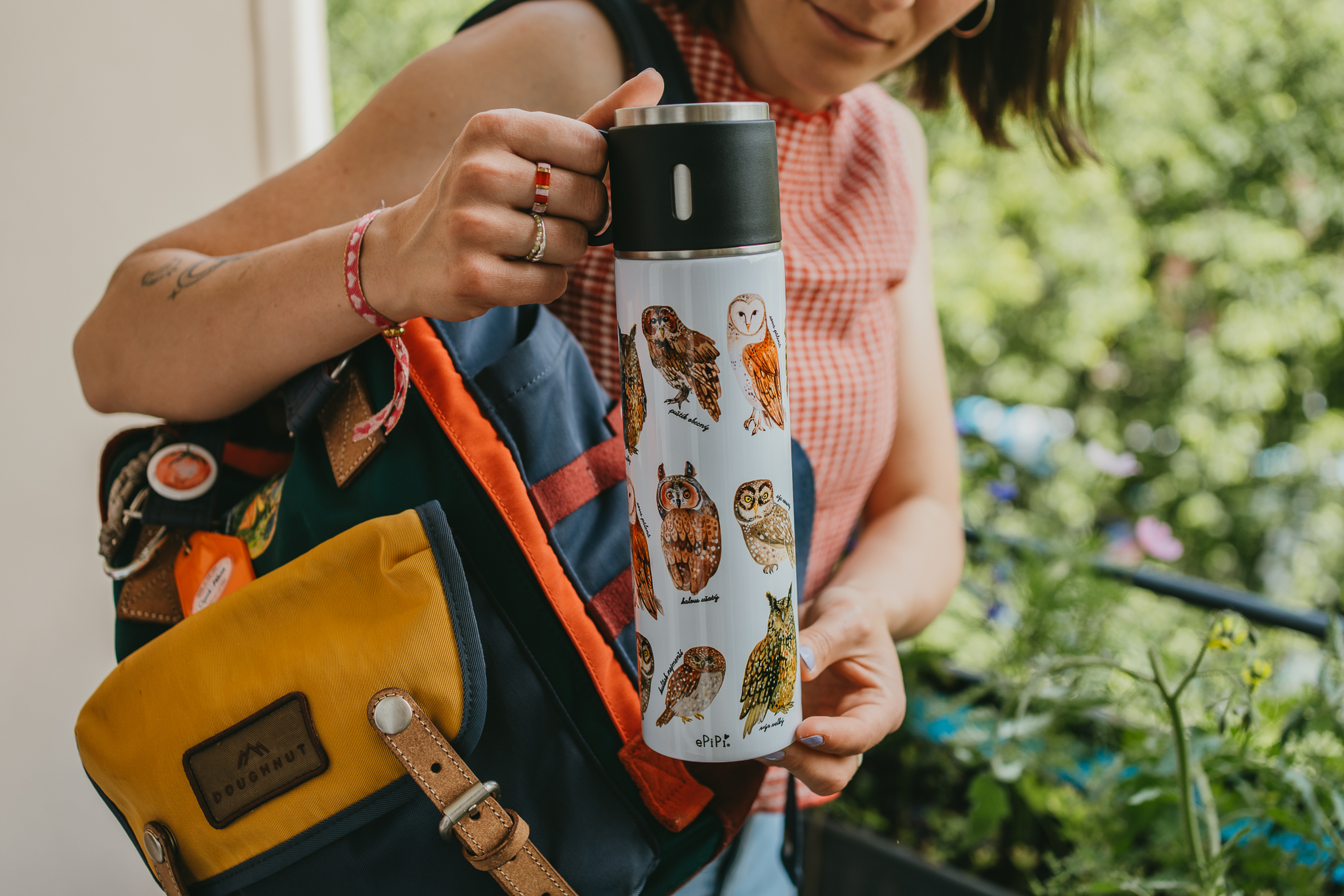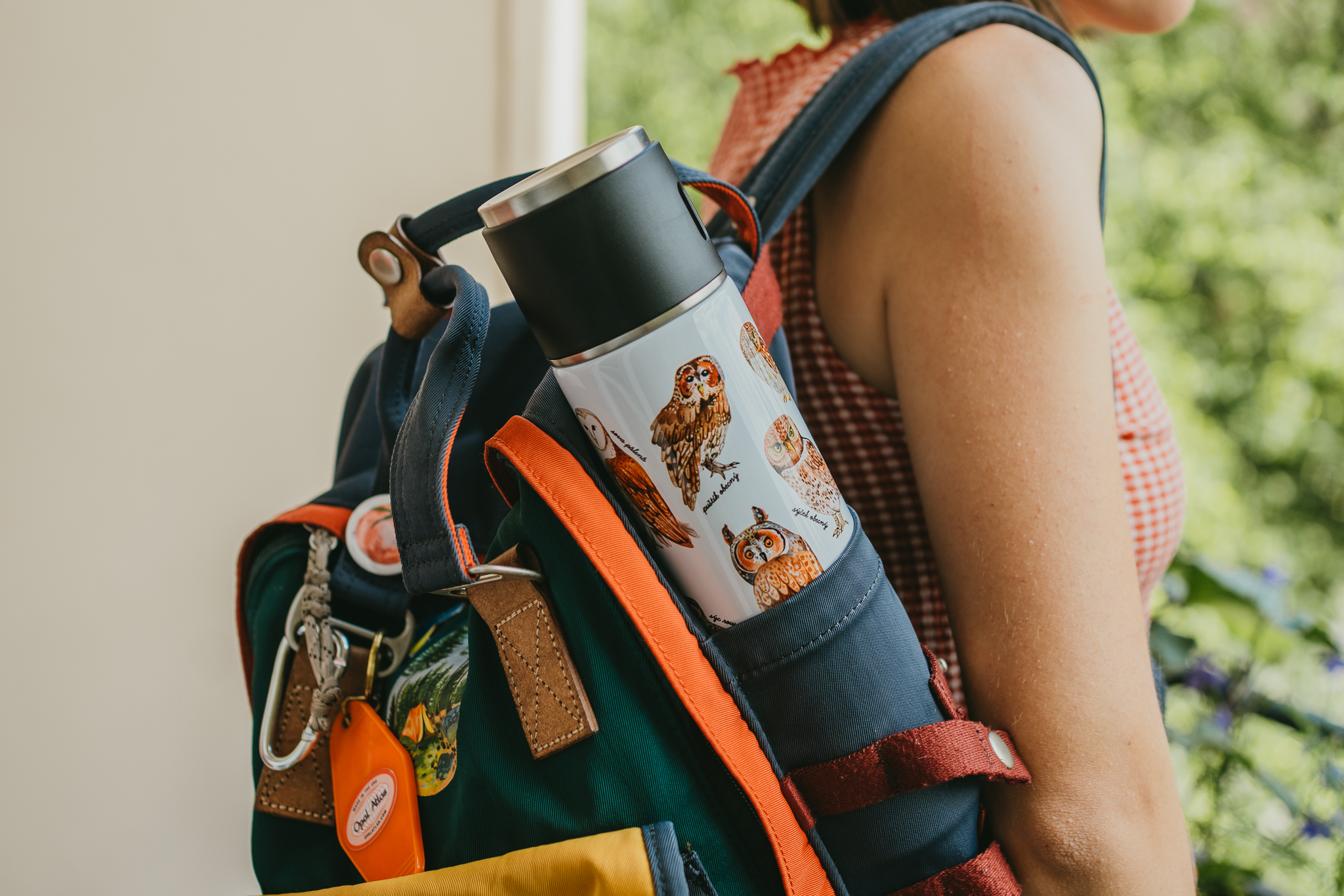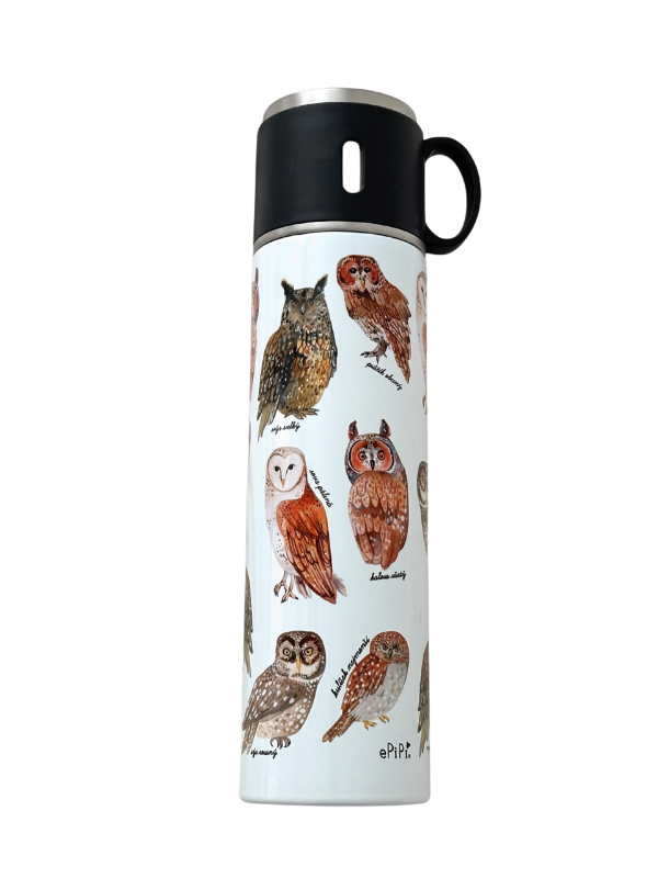 Termoska je potištěná naší autorskou ilustrací českých sov. Ilustrace byla v originále malovaná akvarelem a pastelkami.