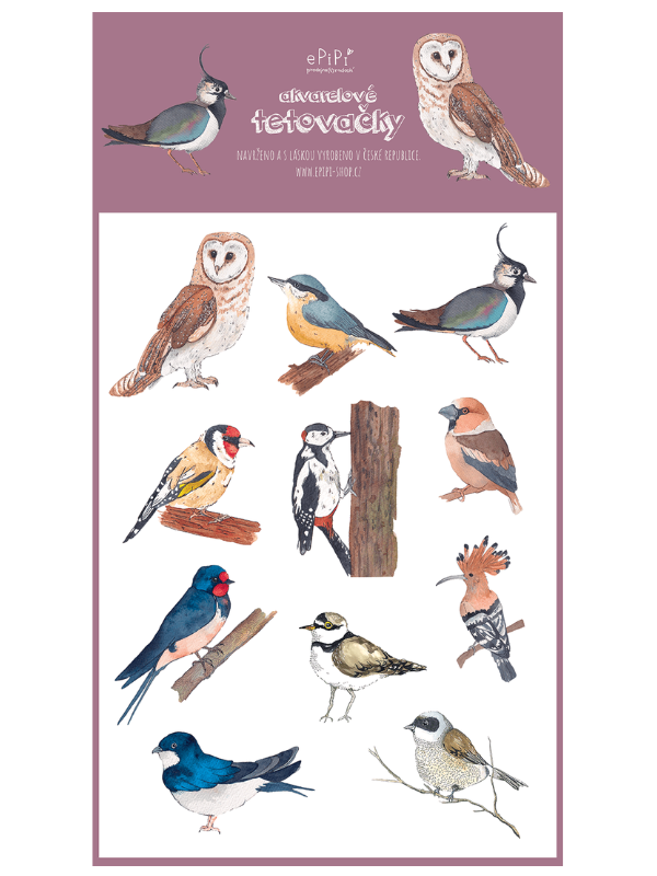 Dočasné tetovací obtisky s autorskými ilustracemi ptáčků z našich lesů. Velikost archu 10×15 cm. Dočasné tetovačky s autorskými akvarelovými motivy ptáčků. Tetovačky jsou skvělou ozdobou na léto, oslavy, další speciální příležitosti a nebo prostě jen tak. 🙂 Na archu najdete celkem 11 druhů ptáků – obtisků: čejka chocholatá, brhlík lesní, sova pálená, dlask tlustozobý, strakapoud obecný, strnad obecný, dudek chocholatý, kulík…